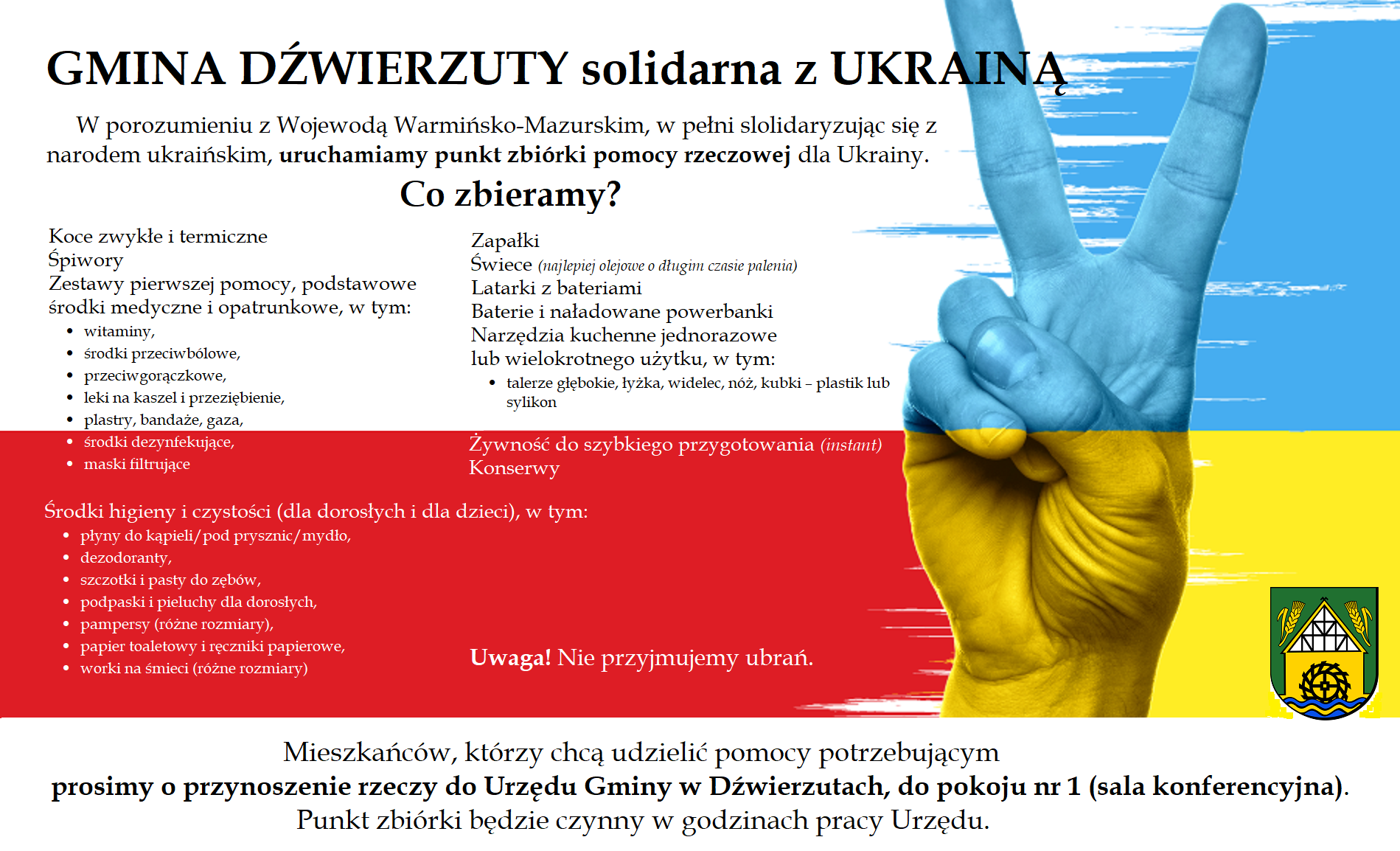 Jednocześnie informujemy o zbiórce organizowanej przez Gminę Dźwierzuty. Szczegóły znajdą Państwo na zdjęciu poniżej.