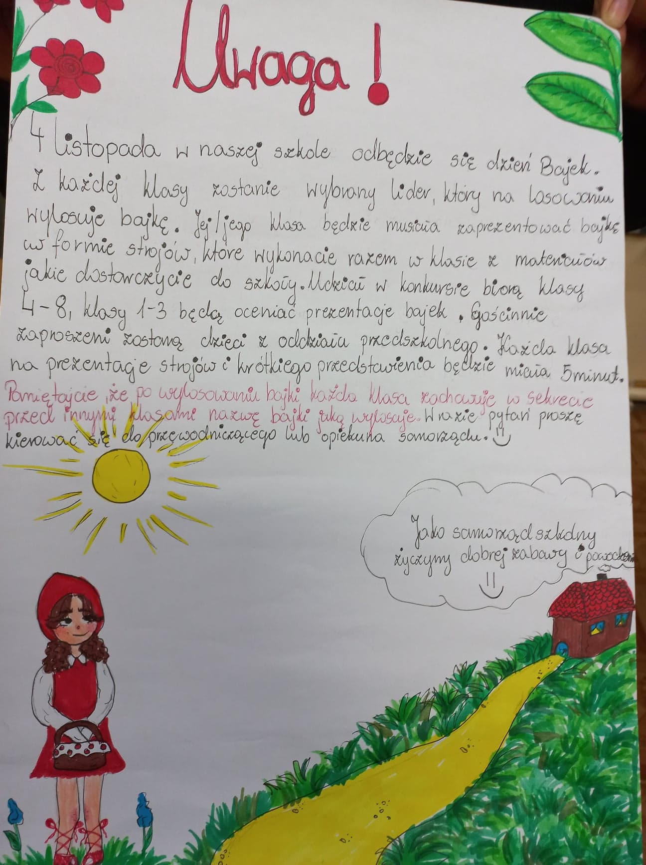 Już 4 listopada po raz pierwszy w naszej szkole będziemy obchodzić Dzień Postaci z Bajek. Szczegóły na plakacie przygotowanym przez Samorząd Uczniowski. Zapraszamy do aktywnego udziału.