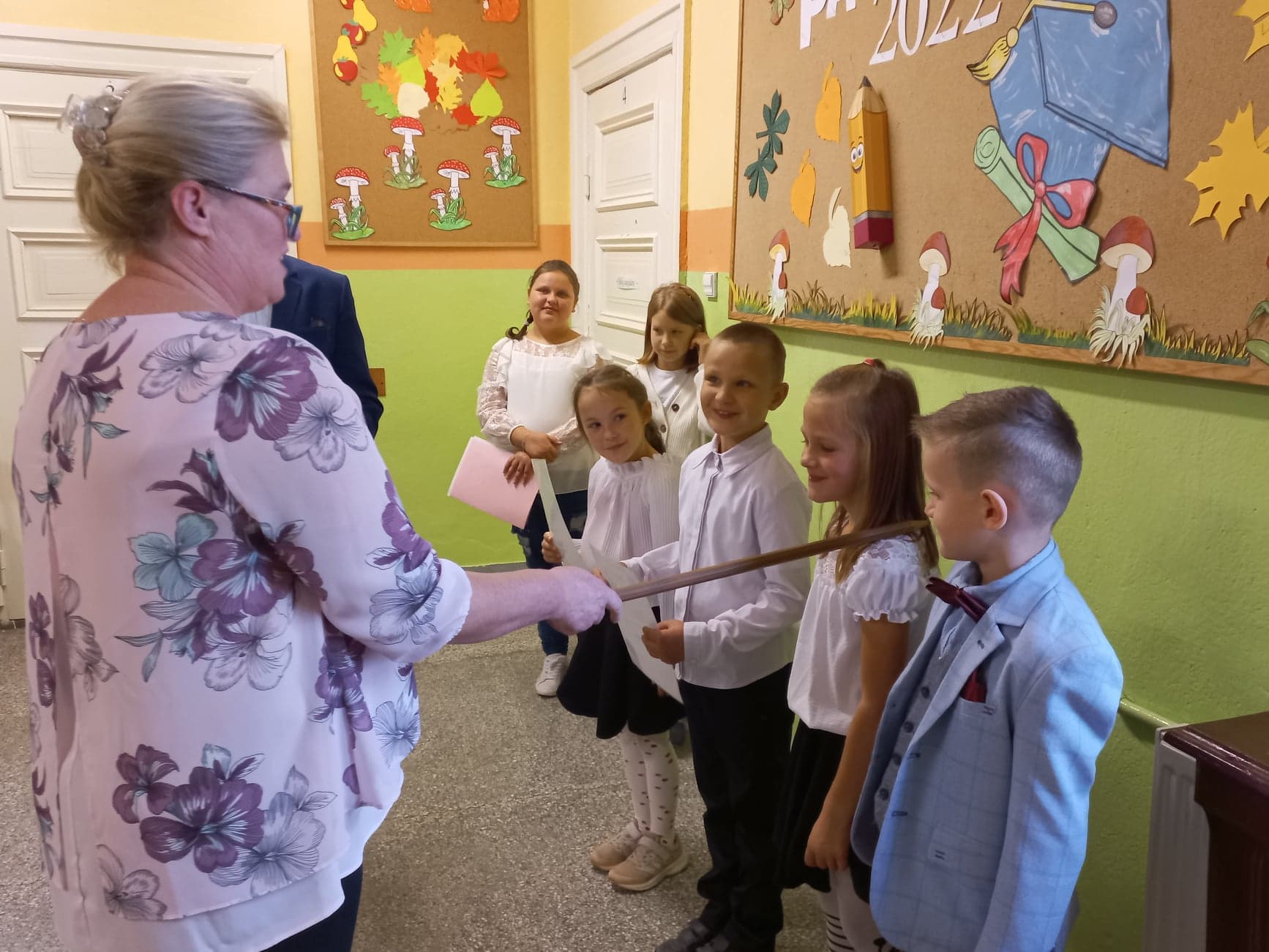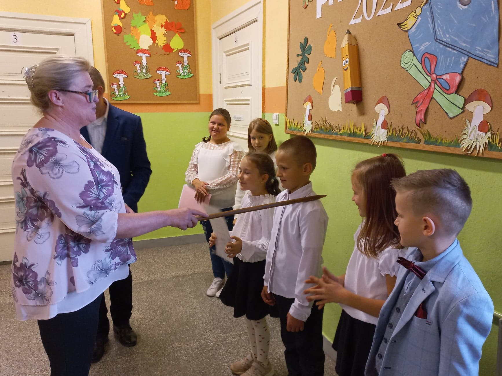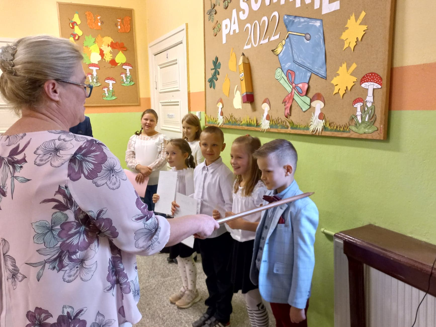 Pierwszoklasiści po krótkiej części artystycznej złożyły ślubowanie i zostali przyjęci w szeregi szkolnej braci przez Panią Dyrektor Hannę Fabiańską. Po uroczystości Pierwszoklasiści zostali obdarowani prezentami przez wychowawcę, Panią dyrektor oraz rodziców. Niespodziankę dla nich przygotowali również uczniowie klas 2 i 3 wraz z wychowawczynią. Starsi koledzy złożyli im piękne życzenia oraz wręczyli upominki.