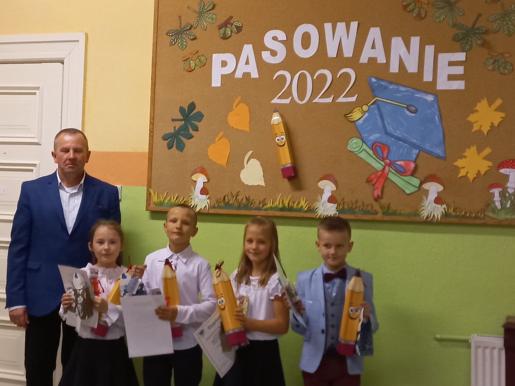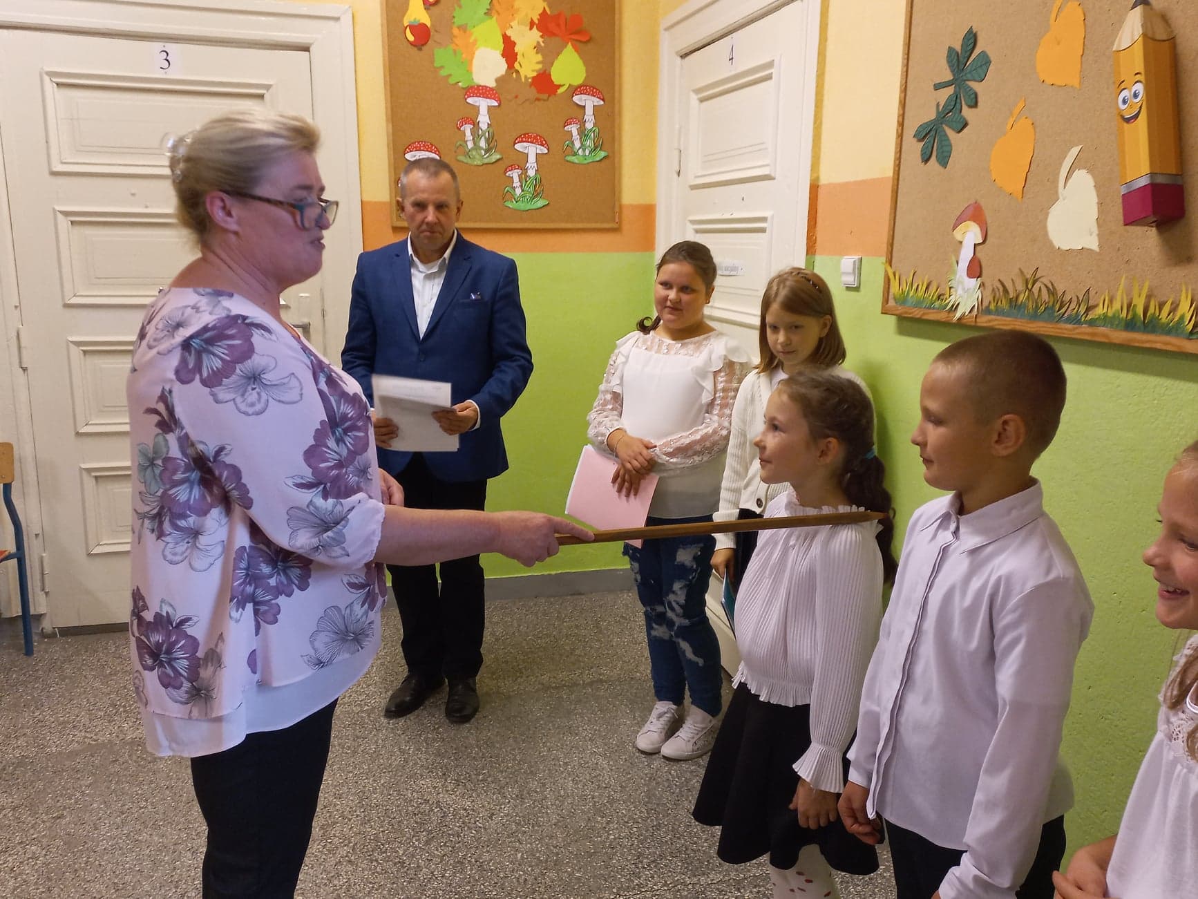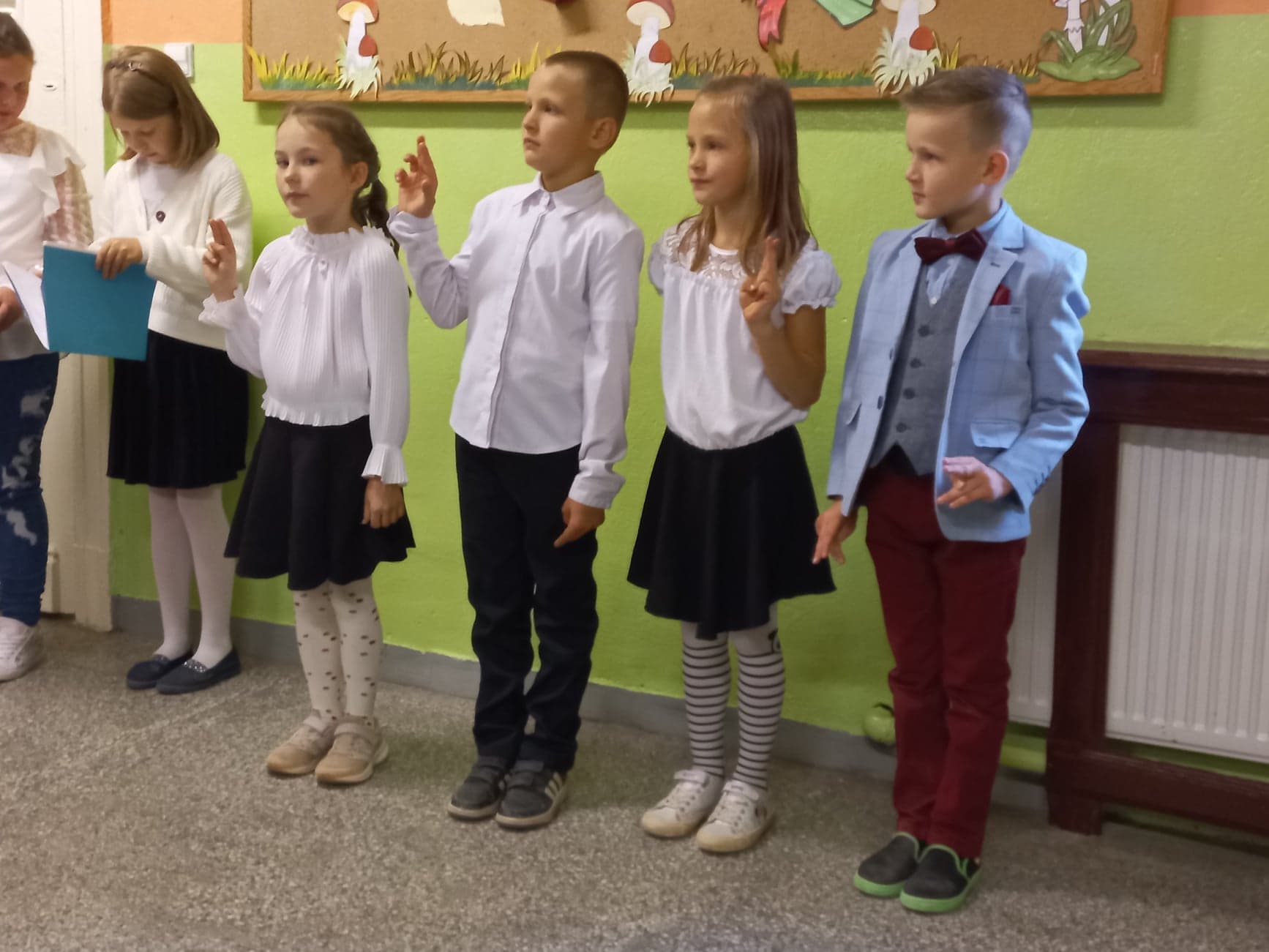 Pierwszoklasiści po krótkiej części artystycznej złożyły ślubowanie i zostali przyjęci w szeregi szkolnej braci przez Panią Dyrektor Hannę Fabiańską. Po uroczystości Pierwszoklasiści zostali obdarowani prezentami przez wychowawcę, Panią dyrektor oraz rodziców. Niespodziankę dla nich przygotowali również uczniowie klas 2 i 3 wraz z wychowawczynią. Starsi koledzy złożyli im piękne życzenia oraz wręczyli upominki.